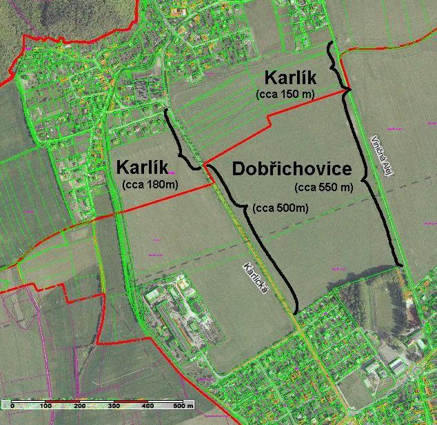 Na katastrálním území obce Karlík leží z celkové délky budoucího chodníku cca 180 metrů, dalších 500 metrů je již v katastrálním území města Dobřichovice. (Obdobně u Viničné Aleje je na území Karlíka cca 150 metrů, na území Dobřichovic cca 550 metrů). Z tohoto důvodu je nutno postup koordinovat také s městem Dobřichovice, které již začalo s výstavbou chodníku podél silnice, i ve Viničné aleji.